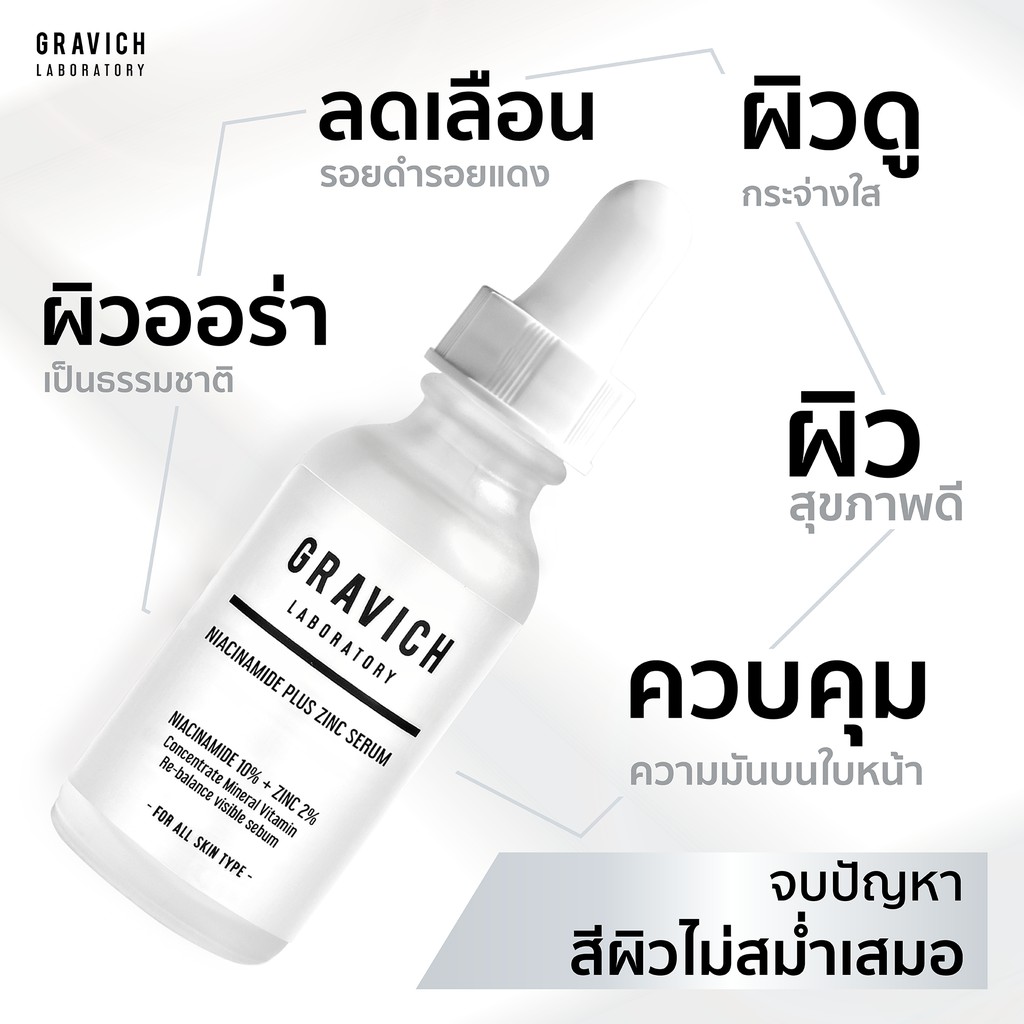 เซรั่มลดสิว ลดริ้วรอย ลดรอยดำ ลดรอยแดงต่างๆ ที่เกิดจากสิว อีกทั้งยังช่วยกระชับรูขุมขนให้เล็กลงด้วย Gravich Niacinamide Plus Zinc Serum จากงานวิจัยในปี 1990 เป็นต้นมา นักวิทยาศาสตร์เครื่องสำอางทั่วโลกได้นำผลการวิจัยกลไกการทำงาน ของ Zinc และ Vitamin B3 มาใช้ในสูตรกันอย่างแพร่หลาย เพราะเป็นส่วนผสมหลักที่สำคัญนั่นเอง